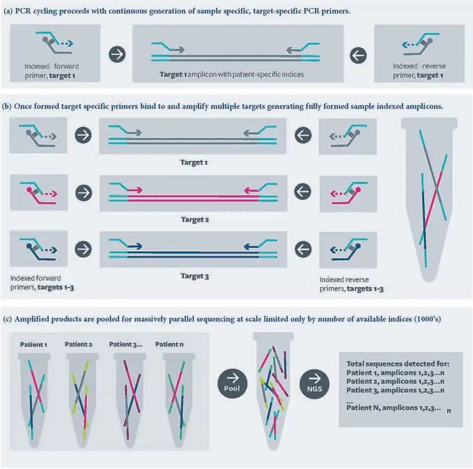 Representation of a typical multiplex RC-PCR for generating amplicon libraries for downstream analysis by Illumina next generation sequencing. Multiple targets are amplified and dual indexed in a single closed tube reaction. Target specific primer generation occurs in the first and subsequent rounds with target amplification and amplicon generation occurring in the second and  subsequent rounds of thermal cycling.