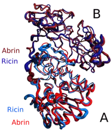 A comparison of the similar structures of abrin-a (red) and ricin (blue)