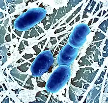 The bacterium transmits from an infected rat (or other mammalian host) to a susceptible rat flea (or other arthropod vector) through a blood meal, and is then transmitted from an infected flea to another susceptible rat through direct contact with the infectious feces or tissues of the vector.[8][18][11] Transmission through contact with arthropod feces may be through an open wound, the respiratory tract (inhalation), or the conjunctivae of the mammalian host.[18] There is evidence that flea bite transmission is possible as well after the bacterium undergoes a certain incubation period in the arthropod vector.[18] Female fleas can also pass the infection onto offspring through transovarial transmission.[8][18] R. typhi appears to be in a truly commensal relationship with these insect and non-human hosts, as it only produces an asymptomatic infection that has no effect on host life span or reproductivity.[18] Because of its versatility in transmission, the R. typhi bacterium is very successful in perpetuating its numbers in endemic regions.[18]