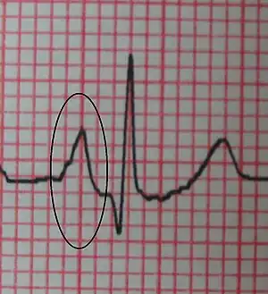 It is characterized by a high P wave amplitude (P pulmonale), i.e. a height greater than 2.5 mm in inferior ECG leads (II, III, aVF); and greater than 1.5 mm in right sided precordial leads (V1, V2). [2]
