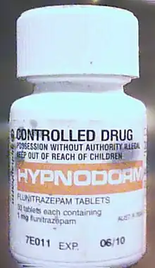Flunitrazepam, also known as Rohypnol among other names, is a benzodiazepine which has been used to treat trouble sleeping and to assist with anesthesia.[3][4] It is not an initially recommended treatment and is only recommended for short-term use.[3][5]