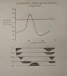 The main role of a sinoatrial node cell is to initiate action potentials of the heart that can pass through cardiac muscle cells and cause contraction. An action potential is a rapid change in membrane potential, produced by the movement of charged atoms (ions). In the absence of stimulation, non-pacemaker cells (including the ventricular and atrial cells) have a relatively constant membrane potential; this is known as a resting potential. This resting phase (see cardiac action potential, phase 4) ends when an action potential reaches the cell. This produces a positive change in membrane potential, known as depolarization, which is propagated throughout the heart and initiates muscle contraction. Pacemaker cells, however, do not have a resting potential. Instead, immediately after repolarization, the membrane potential of these cells begins to depolarise again automatically, a phenomenon known as the pacemaker potential. Once the pacemaker potential reaches a set value, the threshold potential, it produces an action potential.[2] Other cells within the heart (including the Purkinje fibers[11] and atrioventricular node) can also initiate action potentials; however, they do so at a slower rate and therefore, if the SA node is functioning properly, its action potentials usually override those that would be produced by other tissues.[12]