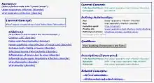 Earlier SNOMED versions had faceted structure ordered by semantic axes, requiring that more complex situations required to be coded by a coordination of different codes. This had two major shortcomings. On the one hand, the necessity of post-coordination was perceived as a user-unfriendly obstacle, which has certainly contributed to the rather low adoption of early SNOMED versions. On the other hand, uniform coding was difficult to obtain. E.g.,Acute appendicitis could be post-coordinated in three different ways[21] with no means to compute semantic equivalences. SNOMED RT had addressed this problem by introducing description logic formula. With the addition of CTV3 a large number of concepts were redefined using formal expressions. However, the fusion with CTV3, as a historically grown terminology with many close-to user descriptions, introduced some problems which still affect SNOMED CT. In addition to a confusing taxonomic web of many hierarchical levels with massive multiple inheritance (e.g. there are 36 taxonomic ancestors for Acute appendicitis), many ambiguous, context-dependent concepts have found their way into SNOMED CT. Pre-coordination was sometimes pushed to extremes, so there are, for example, 350 different concepts for burns found on the head.