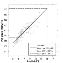 The amplitude of a saccade is the angular distance the eye travels during the movement. For amplitudes up to 15 or 20°, the velocity of a saccade linearly depends on the amplitude (the so-called saccadic main sequence,[10] a term borrowed from astrophysics; see Figure). For amplitudes larger than 20°, the peak velocity starts to plateau[10] (nonlinearly) toward the maximum velocity attainable by the eye at around 60°. For instance, a 10° amplitude is associated with a velocity of 300°/s, and 30° is associated with 500°/s.[11] Therefore, for larger amplitude ranges, the main sequence can best be modeled by an inverse power law function.[12]