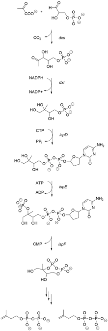 Terpenoids are biosynthesized from two 5-carbon precursors, isopentenyl diphosphate (IPP) and dimethylallyl diphosphate (DMAPP). The NMR and MS study by Zjawiony suggested that the biosynthesis of salvinorin A proceeds via the 1-deoxy-d-xylulose-5-phosphate pathway. In the deoxyxylulose phosphate pathway, D-glyceraldehyde 3-phosphate and pyruvate, the intermediates of the glycolysis, are converted into 1-deoxy-D-xylulose 5-phosphate via decarboxylation. Subsequent reduction with NADPH generates 2C-methyl-D-erythritol 2,4-cyclodiphosphate, via the intermediates 4-diphosphocytidyl-2-C-methyl-D-erythritol and 4-diphosphocytidyl-2c-methyl-d-erythritol-2-phosphate, which then lead to IPP and DMAPP.