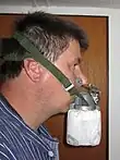Once in use, the respirator has a working life of around two hours.[1] They are used by holding a mouthpiece in the mouth, with the weight of the respirator taken by a headband. A nose clip keeps the nose shut and all breathing, in and out, must be through the mouth and the respirator. In use, the hot air from the respirator is known to be unpleasant to breathe and careful training is needed to reinforce the need to keep breathing through it, not to breathe cold untreated air from around it – the hotter the respirator exhaust, the higher the carbon monoxide concentration and the more dangerous it would be to breathe otherwise. Exhaled air also passes through the respirator mouthpiece and an exhaust valve, but not the catalyst, as damp exhaled air would affect its efficiency. Respirators may provide a heat exchanger to carry away some of their heat in this exhaled air.[1]