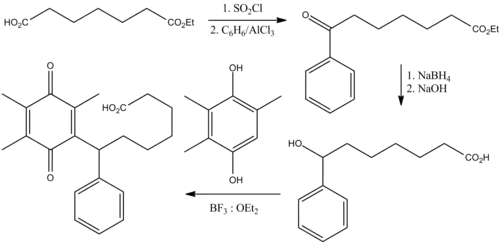 Seratrodast can be prepared in five steps starting from pimelic acid monoester.[15]