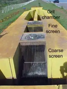 The influent in sewage water passes through a bar screen to remove all large objects like cans, rags, sticks, plastic packets, etc. carried in the sewage stream.[24] This is most commonly done with an automated mechanically raked bar screen in modern plants serving large populations, while in smaller or less modern plants, a manually cleaned screen may be used. The raking action of a mechanical bar screen is typically paced according to the accumulation on the bar screens and/or flow rate. The solids are collected and later disposed in a landfill, or incinerated. Bar screens or mesh screens of varying sizes may be used to optimize solids removal. If gross solids are not removed, they become entrained in pipes and moving parts of the treatment plant, and can cause substantial damage and inefficiency in the process.[25]:9