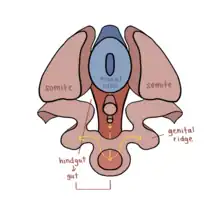 Sex cords are embryonic structures which eventually will give rise (differentiate) to the adult gonads (reproductive organs).[1] They are formed from the genital ridges - which will develop into the gonads - in the first 2 months of gestation (embryonic development) which depending on the sex of the embryo will give rise to male or female sex cords.[2] These epithelial cells (from the genital ridges) penetrate and invade the underlying mesenchyme to form the primitive sex cords.[3] This occurs shortly before and during the arrival of the primordial germ cells (PGCs) to the paired genital ridges.[3] If there is a Y chromosome present, testicular cords will develop via the Sry gene (on the Y chromosome): repressing the female sex cord genes and activating the male.[4][5] If there is no Y chromosome present the opposite will occur, developing ovarian cords.[6][7] Prior to giving rise to sex cords, both XX and XY embryos have Müllerian ducts and Wolffian ducts.[2] One of these structures will be repressed to induce the other to further differentiate into the external genitalia.[2]
