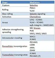 - ↑ Ley, K; Laudanna, C; Cybulsky, MI; Nourshargh, S (September 2007). "Getting to the site of inflammation: the leukocyte adhesion cascade updated". Nature Reviews. Immunology. 7 (9): 678–89. doi:10.1038/nri2156. PMID 17717539. S2CID 1871230.