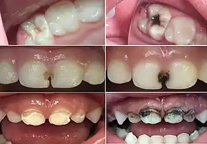 - ↑ Chibinski AC, Wambier LM, Feltrin J, Loguercio AD, Wambier DS, Reis A (2017). "Silver Diamine Fluoride Has Efficacy in Controlling Caries Progression in Primary Teeth: A Systematic Review and Meta-Analysis". Caries Research. 51 (5): 527–541. doi:10.1159/000478668. PMID 28972954. S2CID 5129645.