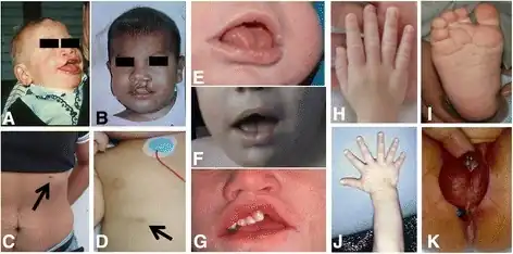 a-b) Cleft lip, coarse, square face c-d) extra-nipple carrier mother/toddler e-g) large tongue, teeth malposition, repaired cleft h-j) polydactyly i) plantar creases k) abnormal genitalia , proximal anal placement