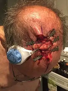 There are medical devices that helps close large wounds. The device uses skin anchors that are attached to healthy skin, an adjustable tension controller then exerts a constant pulling tension on sutures looped around the skin anchors, the device gradually closes the wound over time.[16]