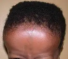 Frontal bossing is the development of an unusually pronounced forehead which may also be associated with a heavier than normal brow ridge. It is caused by enlargement of the frontal bone, often in conjunction with abnormal enlargement of other facial bones, skull, mandible, and bones of the hands and feet. Frontal bossing may be seen in a few rare medical syndromes such as acromegaly – a chronic medical disorder in which the anterior pituitary gland produces excess growth hormone (GH).[2] Frontal bossing may also occur in diseases resulting in chronic anemia, where there is increased hematopoiesis and enlargement of the medullary cavities of the skull.[1]