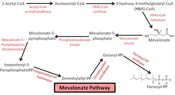 In humans, cholesterol synthesis begins with the mevalonate pathway (see diagram), leading to the synthesis of farnesyl pyrophosphate (FPP). This pathway uses two acetyl-CoA and two NADPH to make mevalonate, which is metabolized to isopentenyl pyrophosphate (IPP) using three ATP. From there, three IPP are needed to make one FPP. The combination of two FPP leads to the formation of squalene; this represents the first committed step towards cholesterol biosynthesis.[10] Squalene leads to the creation of lanosterol, from which there are multiple pathways that lead to cholesterol biosynthesis. The rate limiting step of cholesterol synthesis is the conversion of 3-hydroxy-3-methylglutaryl-CoA (HMG-CoA) to mevalonate, this is an early step in the mevalonate pathway catalyzed by HMG-CoA reductase.