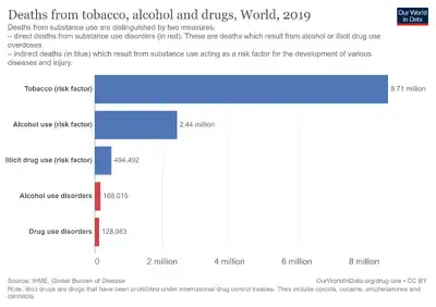 Tobacco use is the single greatest cause of preventable death globally.[5] As many as half of people who use tobacco die from complications of tobacco use.[3] The World Health Organization (WHO) estimates that each year tobacco causes about 6 million deaths (about 10% of all deaths) with 600,000 of these occurring in non-smokers due to second hand smoke.[3][6] In the 20th century tobacco is estimated to have caused 100 million deaths.[3] Similarly, the United States Centers for Disease Control and Prevention describes tobacco use as "the single most important preventable risk to human health in developed countries and an important cause of premature death worldwide."[7] Currently, the number of premature deaths in the U.S. from tobacco use per year outnumber the number of workers employed in the tobacco industry by 4 to 1.[8] According to a 2014 review in the New England Journal of Medicine, tobacco will, if current smoking patterns persist, kill about 1 billion people in the 21st century, half of them before the age of 70.[9]