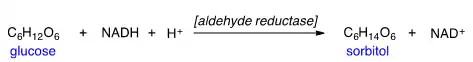 Sorbitol may be synthesised via a glucose reduction reaction[5] in which the converted aldehyde group is converted into a hydroxyl group. The reaction requires NADH and is catalyzed by aldose reductase. Glucose reduction is the first step of the polyol pathway of glucose metabolism, and is implicated in multiple diabetic complications.