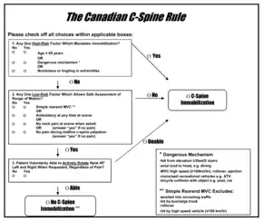 - ↑ Michaleff, ZA; Maher, CG; Verhagen, AP; Rebbeck, T; Lin, CW (6 November 2012). "Accuracy of the Canadian C-spine rule and NEXUS to screen for clinically important cervical spine injury in patients following blunt trauma: a systematic review". Canadian Medical Association Journal. 184 (16): E867-76. doi:10.1503/cmaj.120675. PMC 3494329. PMID 23048086.