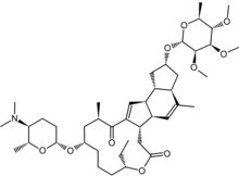The bacteria produce yellowish-pink aerial hyphae, with bead-like chains of spores enclosed in a characteristic hairy sheath.[11] This genus is defined as aerobic, Gram-positive, nonacid-fast actinomycetes with fragmenting substrate mycelium. S. spinosa was isolated from soil collected inside a nonoperational sugar mill rum still in the Virgin Islands. Spinosad is a mixture of chemical compounds in the spinosyn family that has a generalized structure consisting of a unique tetracyclic ring system attached to an amino sugar (D-forosamine) and a neutral sugar (tri-Ο-methyl-L-rhamnose).[4] Spinosad is relatively nonpolar and not easily dissolved in water.[12] Spinosad is an insecticide derived from a family of natural products obtained by fermentation of S. spinosa. Spinosyns occur in over 20 natural forms, and over 200 synthetic forms (spinosoids) have been produced in the lab.[10] Spinosad contains a mix of two spinosoids, spinosyn A, the major component, and spinosyn D (the minor component), in a roughly 17:3 ratio.[11]