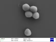 Staphylococcus haemolyticus is a member of the coagulase-negative staphylococci (CoNS).[2] It is part of the skin flora of humans,[3] and its largest populations are usually found at the axillae, perineum, and inguinal areas.[4] S. haemolyticus also colonizes primates and domestic animals.[4] It is a well-known opportunistic pathogen, and is the second-most frequently isolated CoNS (S. epidermidis is the first).[5] Infections can be localized or systemic, and are often associated with the insertion of medical devices.[6][7][8] The highly antibiotic-resistant phenotype and ability to form biofilms make S. haemolyticus a difficult pathogen to treat.[5] Its most closely related species is Staphylococcus borealis.[9]