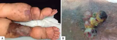 | a) Exuberant lymphedema in both legs. Right leg presents multiple tumors on brown sclerotic plaque. b) Detail of the tumor area, siteof the biopsy | |