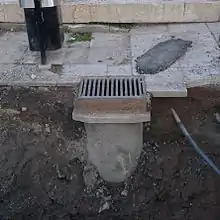 There are two main types of stormwater drain (highway drain or road gully in the UK) inlets: side inlets and grated inlets. Side inlets are located adjacent to the curb and rely on the ability of the opening under the back stone or lintel to capture flow. They are usually depressed at the invert of the channel to improve capture capacity.[3]