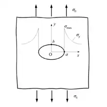 E. Kirsch derived the equations for the elastic stress distribution around a hole. The maximum stress felt near a hole or notch occurs in the area of lowest radius of curvature. In an elliptical hole of length and width , under a far-field stress , the stress at the ends of the major axes is given by Inglis' equation:[5]
