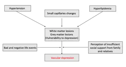 Researchers hypothesize that vascular depression disrupts processes in certain parts of the brain to put individuals at risk for developing depression. Two primary mechanisms have been proposed: one associates white matter lesions (attributed to cardiovascular burden) and cerebrovascular risk factors.[9][10] These two mechanisms parallel the differences between MRI and clinically defined vascular depression, yet do not necessarily represent contradictory mechanisms. These brain changes are thought to be reflected in the white matter lesions identified by MRI. Cerebrovascular risk factors for vascular depression include high blood pressure, diabetes mellitus, hyperlipidemia, coronary heart disease, and tobacco smoking.[11] However, these factors do not account for all cerebrovascular changes in individuals as genetics may play a large role as well.