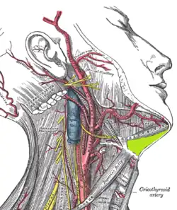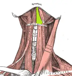 The submental space is a fascial space of the head and neck (sometimes also termed fascial spaces or tissue spaces). It is a potential space located between the mylohyoid muscle superiorly, the platysma muscle inferiorly,[1] under the chin in the midline. The space coincides with the anatomic region termed the submental triangle, part of the anterior triangle of the neck.