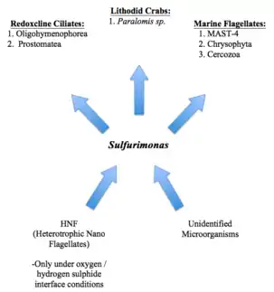 Sulfurimonas (subgroup GD17) dominates chemotrophic denitrification in the Baltic Sea pelagic redoxclines.[14][13][6] Using methods such as predator assays and bacterial amendment cultures, it was found that the population of Sulfurimonas (subgroup GD17) had a doubling time of 1 to 1.5 days, which is much more than their average doubling time under the optimal conditions shown in Table 1.[30] However, grazing can consume the population over the course of one day.[30] Five active grazers that are typically found in redoxclines ciliates (Oligohymenophorea, Prostomatea), and marine flagellate groups (MAST-4, Chrysophyta, Cercozoa), were found through the use of RNA-SIP.[30] In cold-seep ecosystem, Lithodid crabs (Paralomis sp.), which are filter eaters, feed on thiotropic bacterial mats, which consist of many different types of bacteria.[30]