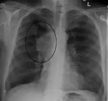 A CXR of a person with lung cancer which was causing superior vena cava syndrome.