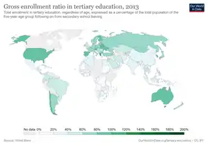 In terms of the progress made, global participation in tertiary education reached 224 million in 2018, equivalent to a gross enrollment ratio of 38%.[13] North Africa and West Asia are among the top regions with the most rapid expansion of tertiary education participation since 2013.[13]