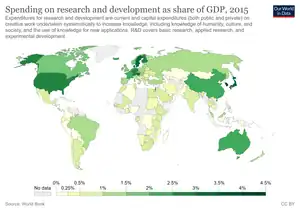 By 2018, research and development constituted an average 1.79% of the global GDP according to the UNESCO Institute for Statistics. Although research expenditure rose in most regions between 2014 and 2018, 80% of countries still invested less than 1% of GDP in research and development by 2018.[16] The G20 countries still accounted for nine-tenths of research expenditure, researchers, publications and patents.[16] In some cases, the researcher population rose faster than related expenditure, leaving less funding available to each researcher.[16] Commitments to SDG 9.5 have not spurred an increase in reporting of data. On the contrary, a total of 99 countries reported data on domestic investment in research in 2015 but only 69 countries in 2018.[16] Similarly, 59 countries recorded the number of researchers (in full-time equivalents) in 2018, down from 90 countries in 2015.[16]