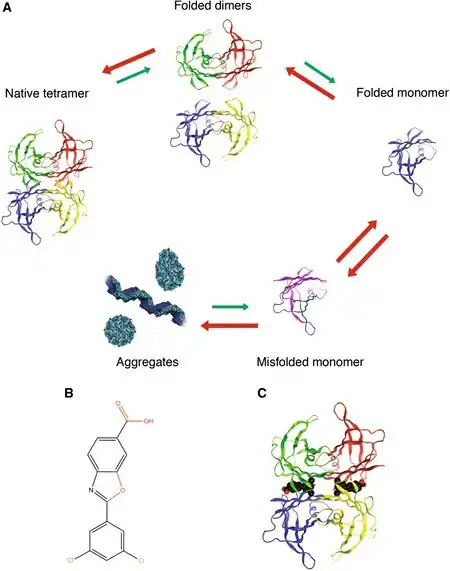 - ↑ Coelho, Teresa; Merlini, Giampaolo; Bulawa, Christine E.; Fleming, James A.; Judge, Daniel P.; Kelly, Jeffery W.; Maurer, Mathew S.; Planté-Bordeneuve, Violaine; Labaudinière, Richard; Mundayat, Rajiv; Riley, Steve; Lombardo, Ilise; Huertas, Pedro (June 2016). "Mechanism of Action and Clinical Application of Tafamidis in Hereditary Transthyretin Amyloidosis". Neurology and Therapy. 5 (1): 1–25. doi:10.1007/s40120-016-0040-x. ISSN 2193-8253.