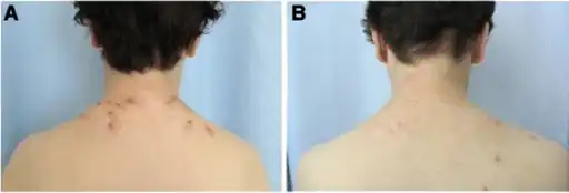 Improvement of dorsal skin lesions after miglustat treatment. Images showing the improvement on miglustat treatment of the dorsal skin lesions resembling prurigo nodularis of the patient with Tangier Disease described in this study. Pictures taken A after 7 months of miglustat discontinuation; B after 6 months of miglustat treatment.