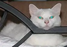 Apart from its eyeshine, the tapetum lucidum itself has a color. It is often described as iridescent. In tigers it is greenish.[15] In ruminants it may be golden green with a blue periphery,[12] or whitish or pale blue with a lavender periphery. In dogs it may be whitish with a blue periphery.[12] The color in reindeer changes seasonally, allowing the animals to better avoid predators in low-light winter at the price of blurrier vision.[16]