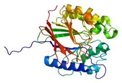 Tartrate-resistant acid phosphatase (TRAP or TRAPase), also called acid phosphatase 5, tartrate resistant (ACP5), is a glycosylated monomeric metalloprotein enzyme expressed in mammals.[3] It has a molecular weight of approximately 35kDa, a basic isoelectric point (7.6–9.5), and optimal activity in acidic conditions. TRAP is synthesized as latent proenzyme and activated by proteolytic cleavage and reduction.[4][5] It is differentiated from other mammalian acid phosphatases by its resistance to inhibition by tartrate and by its molecular weight.