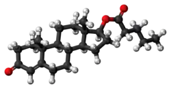 Testosterone valerate, or testosterone pentanoate, also known as androst-4-en-17β-ol-3-one 17β-valerate, is a synthetic, steroidal androgen and an androgen ester – specifically, the C17β valerate ester of testosterone – which is used in veterinary medicine.[1] It is administered via intramuscular injection and acts as a long-lasting prodrug of testosterone.[1] The medication is available as a component of the veterinary drug Deposterona, which is marketed in Mexico and also contains testosterone acetate and testosterone undecanoate.[1] Testosterone valerate is a short-to-medium duration ester of testosterone, with an elimination half-life of approximately twice that of the short-acting testosterone propionate.[1]