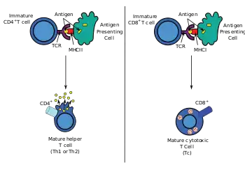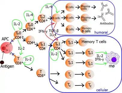 - 1 2 3 Zhu J, Paul WE (September 2008). "CD4 T cells: fates, functions, and faults". Blood. 112 (5): 1557–1569. doi:10.1182/blood-2008-05-078154. PMC 2518872. PMID 18725574.