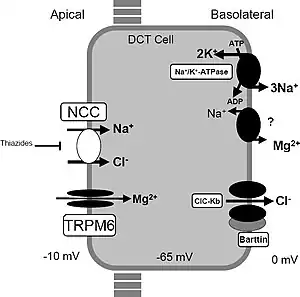 Illustration of the mechanism of action of thiazide diuretics in the distal convoluted tubule of nephrons.