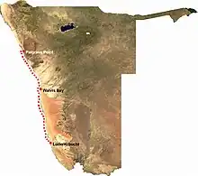 Thiomargarita namibiensis was found in the continental shelf off the coast of Namibia, an area with high plankton productivity, low oxygen concentrations between 0-3 μM, and nitrate concentrations of 5-28 μM.[9] The most bacteria were obtained from the upper 3 cm of sediment in the sample, with concentrations decreasing exponentially past this point. In this section of sediment, there were sulfide concentrations of 100-800 μM.[9] Although previously undiscovered, T. namibiensis is not uncommon by any means in its environment. It is by far the most common benthos bacterium of the Namibian shelf, comprising almost 0.8% of the sediment volume.[16] The organism also has a direct impact on its environment. Apatite, a mineral high in phosphorite, is correlated with the abundance of T. namibiensis through phosphogenesis. Internal polyphosphate and nitrate are used as external electron acceptors in the presence of acetate, releasing enough phosphate to cause precipitation. While the amount directly created by T. namibiensis cannot be calculated, it is a significant contribution to the large amounts of hydroxyapatite in solid-phase shelf sediment.[17]