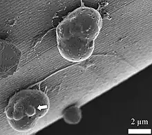 | SEM image of thraustochytrid showing ectoplasmic net. | |