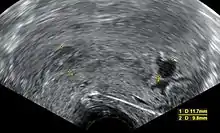 Risk factors for miscarriage include being an older parent, previous miscarriage, exposure to tobacco smoke, obesity, diabetes, thyroid problems, and drug or alcohol use.[7][8] About 80% of miscarriages occur in the first 12 weeks of pregnancy (the first trimester).[1] The underlying cause in about half of cases involves chromosomal abnormalities.[5][1] Diagnosis of a miscarriage may involve checking to see if the cervix is open or closed, testing blood levels of human chorionic gonadotropin (hCG), and an ultrasound.[10] Other conditions that can produce similar symptoms include an ectopic pregnancy and implantation bleeding.[1]