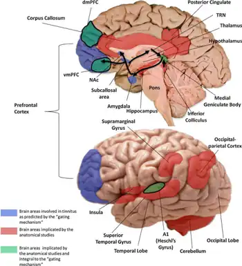 1. 1 2 3 4 Levine, RA; Oron, Y (2015). "Tinnitus". The Human Auditory System - Fundamental Organization and Clinical Disorders. Handbook of Clinical Neurology. Vol. 129. pp. 409–31. doi:10.1016/B978-0-444-62630-1.00023-8. ISBN 9780444626301. PMID 25726282.