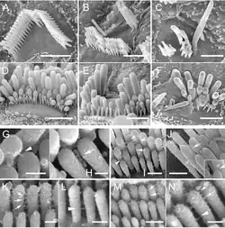 Tip links are extracellular filaments that connect stereocilia to each other or to the kinocilium in the hair cells of the inner ear.[1][2] Mechanotransduction is thought to occur at the site of the tip links, which connect to spring-gated ion channels.[3] These channels are cation-selective transduction channels that allow potassium and calcium ions to enter the hair cell from the endolymph that bathes its apical end. When the hair cells are deflected toward the kinocilium, depolarization occurs; when deflection is away from the kinocilium, hyperpolarization occurs. The tip link is made of two different cadherin molecules, protocadherin 15 and cadherin 23.[4] It has been found that the tip links are relatively stiff, so it is thought that there has to be something else in the hair cells that is stretchy which allows the stereocilia to move back and forth.[5]