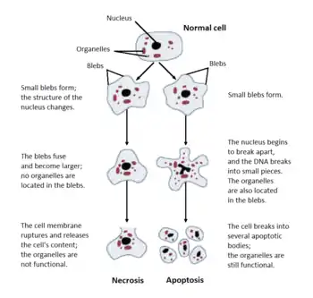 - 1 2 3 4 5 Proskuryakov SY, Konoplyannikov AG, Gabai VL (February 2003). "Necrosis: a specific form of programmed cell death?". Experimental Cell Research. 283 (1): 1–16. doi:10.1016/S0014-4827(02)00027-7. PMID 12565815.