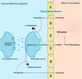 {{cite book}}: CS1 maint: date format (link) - ↑ Dingemanse J, Jorga K, Zürcher G, Schmitt M, Sedek G, Da Prada M, Van Brummelen P (September 1995). "Pharmacokinetic-pharmacodynamic interaction between the COMT inhibitor tolcapone and single-dose levodopa". British Journal of Clinical Pharmacology. 40 (3): 253–62. doi:10.1111/j.1365-2125.1995.tb05781.x. PMC 1365105. PMID 8527287.