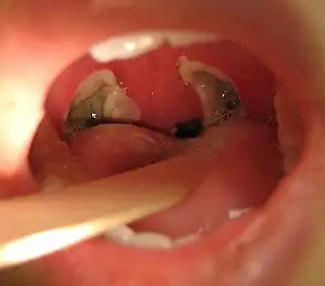 | Typical appearance of the back of the throat three days post tonsillectomy. | |