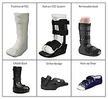 TCC involves encasing the patient's complete foot, including toes, and the lower leg in a specialist cast that redistributes weight and pressure in the lower leg and foot during everyday movements. This redistributes pressure from the foot into the leg, which is more able to bear weight, to protect the wound, letting it regenerate tissue and heal.[4] TCC also keeps the ankle from rotating during walking, which prevents shearing and twisting forces that can further damage the wound.[5]