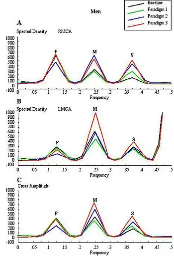 Conventional FTCD has limitations for the study of cerebral lateralization. For example, it may not differentiate the lateralising effects due to stimulus characteristics from those due to light responsiveness, and does not distinguish between flow signals emanating from cortical and subcortical branches of the cerebral arteries of the circle of Willis. Each basal cerebral artery of the circle of Willis gives origin to two different systems of secondary vessels. The shorter of these two is called the ganglionic system, and the vessels belonging to it supply the thalami and corpora striata; the longer is the cortical system, and its vessels ramify in the pia mater and supply the cortex and subjacent brain substance. Furthermore, the cortical branches are divisible into two classes: long and short. The long or medullary arteries pass through the grey substance and penetrate the subjacent white substance to the depth of 3–4 cm. The short vessels are confined to the cortex. Both cortical and ganglionic systems do not communicate at any point in their peripheral distribution, but are entirely independent of each other, having between the parts supplied by the two systems, a borderline of diminished nutritive activity.[18] While, the vessels of the ganglionic system are terminal vessels, the vessels of the cortical arterial system are not so strictly "terminal". Blood flow in these two systems in the middle cerebral artery (MCA) territory supplies 80% of both hemispheres,[19] including most neural substrates implicated in facial processing, language processing and intelligence processing at cortical and subcortical structures. The measurements of mean blood flow velocity (MFV) in the MCA main stem could potentially provide information about downstream changes at cortical and subcortical sites within the MCA territory. Each distal arm of the MCA vascular system could be separated into "near" and "far" distal reflection sites for the cortical and ganglionic (subcortical) systems, respectively. To accomplish this objective, one method is to apply Fourier analysis to the periodic time series of MFV acquired during cognitive stimulations. Fourier analysis would yield peaks representing pulsatile energy from reflection sites at various harmonics, which are multiples of the fundamental frequency.[20][21] McDonald in 1974 showed that the first five harmonics usually contain 90% of the entire pulsatile energy within the system of pressure/flow oscillations in the peripheral circulation. It could be presumed that each arm of the vascular system represents a single viscoelastic tube terminated by impedance, creating a single reflection site.[22] Psychophysiologic stimulation induced vasomotor activity at each terminal site sets up a standing sinusoidal wave oscillation, comprising a summation of waves due to effects of incident, reflected, and re-reflected waves from distal to proximal point of measurement. fTCDS studies are performed with the participant placed in a supine posture with their head up at about 30 degrees. The probe holder headgear (e.g. LAM-RAK, DWL, Sipplingen, Germany) are used with a base support on two earplugs and on the nasal ridge. Two 2-MHz probes are affixed in the probe holder and insonation performed to determine the optimal position for continuous monitoring of both MCA main stems at 50 mm depth from the surface of the probe. A serial recording of MFV for each stimulus is acquired and latter used for Fourier analysis. Fourier transform algorithm uses standard software (for example, Time series and forecasting module, STATISTICA, StatSoft, Inc.). The most efficient standard Fourier algorithm requires that the length of the input series is equal to a power of 2. If this is not the case, additional computations have to be performed. To derive the required time series, the data were averaged in 10-second segments for 1-minute duration or each stimulus, yielding 6 data points for each participant and a total of 48 data points for all eight men and women, respectively. Smoothing the periodogram values was accomplished using a weighted moving average transformation. Hamming window was applied as a smoother.[23][24] The spectral density estimates, derived from single series Fourier analysis, were plotted, and the frequency regions with the highest estimates were marked as peaks. The origins of the peaks are of interest in order to determine the reliability of the present technique. The fundamental (F), cortical (C) or memory (M), and subcortical (S) peaks occurred at regular frequency intervals of 0.125, 0.25, and 0.375, respectively. These frequencies could be converted to Hz, assuming that the fundamental frequency of cardiac oscillation was the mean heart rate. The fundamental frequency (F) of the first harmonic could be determined from the mean heart rate per second. For example, a heart rate of 74 bpm, suggests 74 cycles/60 or 1.23 Hz. In other words, the F-, C-, and S-peaks occurred at multiples of the first harmonic, at second and third harmonics, respectively. The distance of the reflection site for F-peak could be presumed to emanate from a site at D1 = wavelength/4 = cf/4 = 6.15 (m/s)/(4×1.23 Hz) = 125 cm, where c is the assumed wave propagation velocity of the peripheral arterial tree according to McDonald, 1974. Given the vascular tortuosity, the estimated distance approximates that from the measurement site in the MCA main stem, to an imaginary site of summed reflections from the upper extremities, close to the finger tips when stretched sideways.[25] The C-peak occurred at the second harmonic, such that the estimated arterial length (using common carotid c = 5.5 m/s)[26] was given by D2 = wavelength/8 = cf2/8 = 28 cm, and a frequency f of 2.46 Hz. The distance approximates the visible arterial length from the main stem of the MCA, through vascular tortuosity and around the cerebral convexity, to the end vessels at distal cortical sites such as the occipito-temporal ju